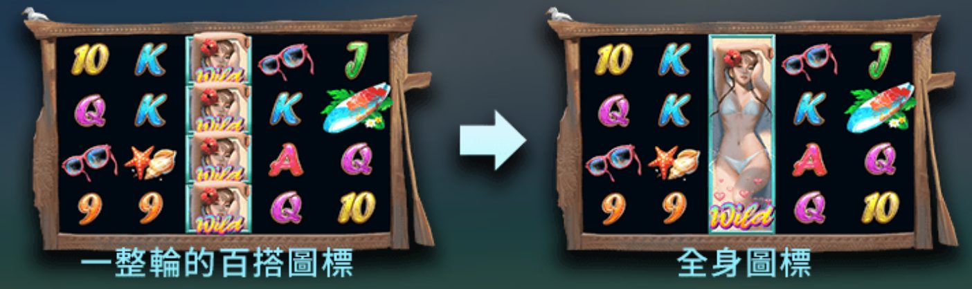 BT電子海灘寶貝同時也是本作的百搭符號,她不只讓畫面充滿陽光氣息,更具備強大的實戰價值,可取代除免費旋轉符號之外的所有符號,任何當她出現在連線中,都能協助完成高額獎勵組合。