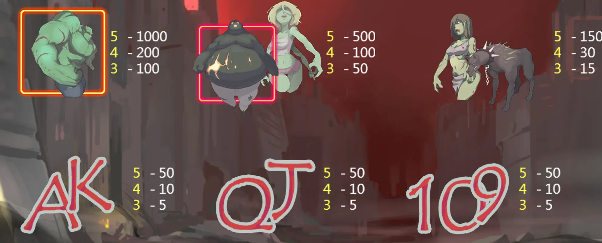 主要高賠付符號包括肌肉型殭屍,5個符號可獲得1000倍獎金,4個為200倍,3個也有100倍,這是遊戲中的「終極大獎」角色,出現時絕對值得歡呼;胖殭屍這個符號雖不如肌肉殭屍稀有,但出現機率稍高,5個給500倍,4個為100倍,3個也有50倍,算是高機率的中獎主力。