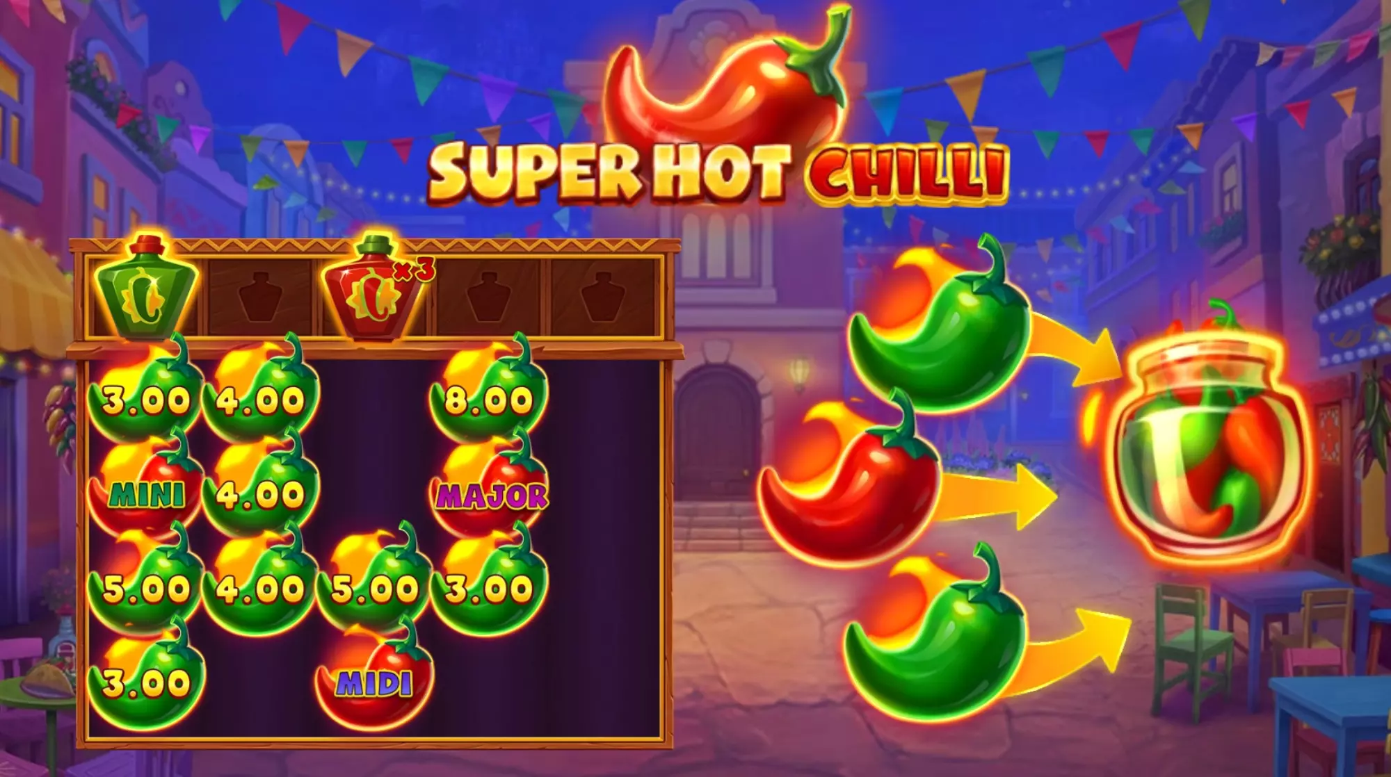 每一顆辣椒上面都有不同的獎金數字,這些都是你最終可以帶走的彩金。辣椒會持續掉落,如果再出現新的辣椒,不僅會鎖定在盤面上,還會重置三次免費掉落的次數。直到盤面上再也沒有新辣椒出現為止,最後再把所有辣椒上的數字全部加總,就是你這一局的超級獎勵。