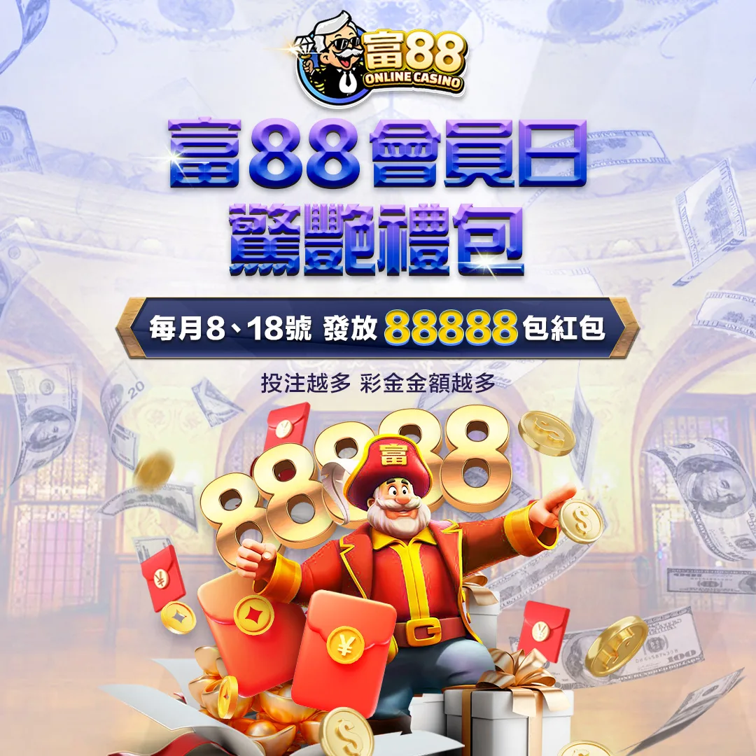 每月發放總獎金1億,富88娛樂城所有會員,都有機會獲得『登入驚艷禮包』,優惠於每月8號、18派發完畢 會第一時間群發通知 請關注富88客服中心!彩金達成有效投注一倍,請務必在指定日期登入查看唷~